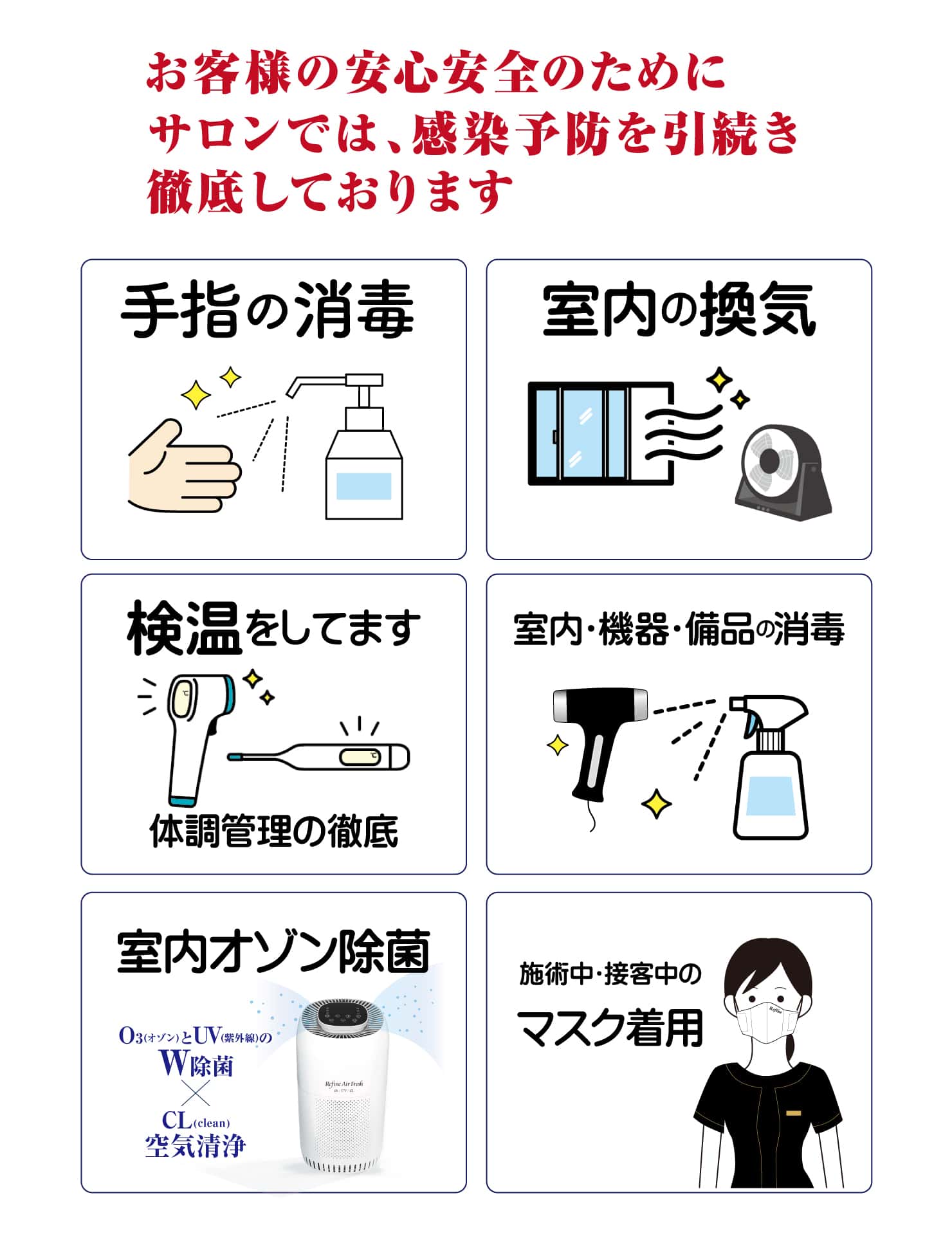 いつもラヴィールサロンをご利用いただき、ありがとうございます。 新型コロナウイルス感染の拡大を防ぐため、お客様には以下の点をご理解・厳守いただきますようお願い申し上げます。